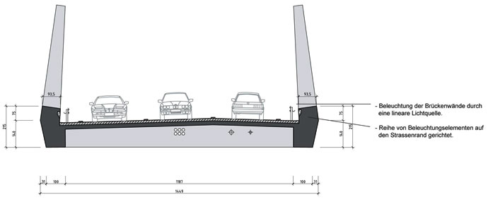 Le pont est imaginé comme un lien asymétrique entre deux rives différentes: la route en tunnel émerge de la rive droite, franchit l'Aar avant de rejoindre, à niveau, le quartier de la rive gauche.