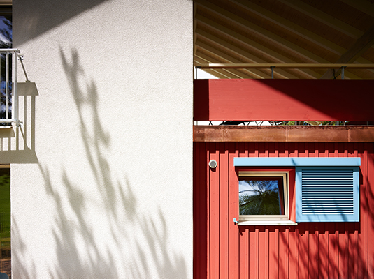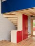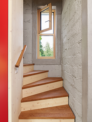 La dépendance telle qu'elle se présentait avant les travaux était une construction très brute faite principalement de «plots de paysan», c'est-à-dire de briques en ciment artisanales et d'une charpente en bois. Les plots de ciment, structure de base du bâtiment ont été valorisés par un nettoyage et une peinture grise très claire. Le plancher et la charpente ont été remplacés. Le sol du rez de chaussée est revêtu d'une chape poncée (après isolation du soubassement), celui de l'étage est revêtu de parquet. Le bois, peint ou brut, est largement utilisé pour toutes les nouvelles interventions et l'aménagement intérieur. Il apporte délicatesse et ergonomie pour le nouvel usage du bâtiment.
