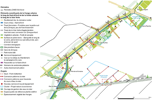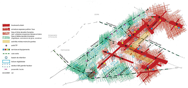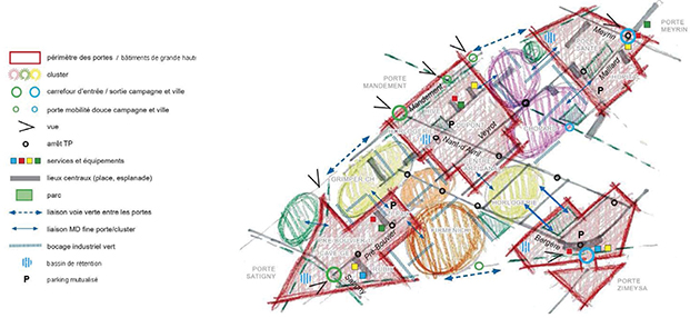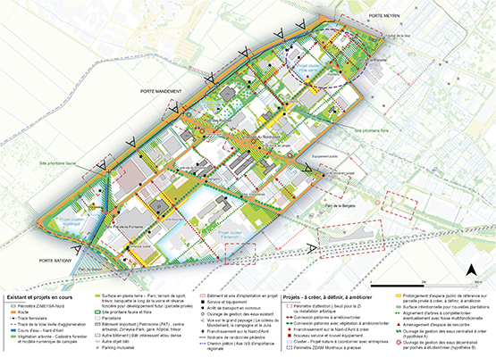Trois scénarios ont été élaborés - Paysage, Densité et Portes - afin de mettre en discussion divers thèmes, options ou projets en cours. Les principes émergeant des échanges avec les participants à l'étude et les services des diverses administrations ont ensuite été synthétisés et interprétés selon cinq grands principes d'aménagement pour la ZIMEYSA-Nord: