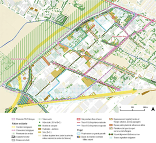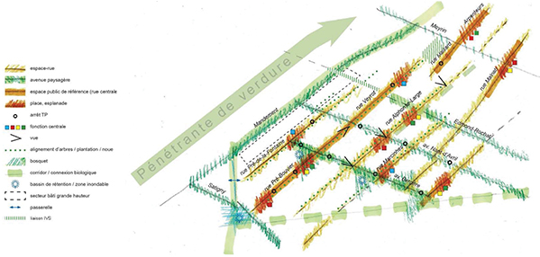 Quant aux thématiques environnementales, il est renvoyé aux principes de gestion des eaux pluviales selon la démarche "Eau en ville" menée par l'OCEau, le taux de canopée est accru, les milieux à protéger sont repérés et des connexions biologiques établies, un réseau thermique structurant est identifié sur ce secteur à l'horizon 2050, les déchets urbains et d'exploitation des entreprises sont respectivement à optimiser et mutualiser, etc.